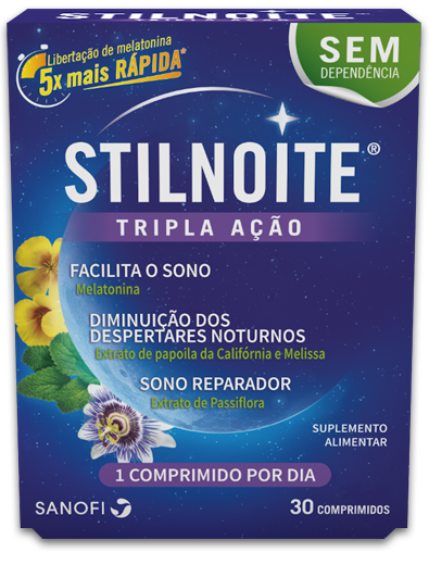 Suplemento alimentar com tripla ação no sono: reduz o tempo necessário para adormecer, reduz os despertares noturnos e promove um sono reparador.
