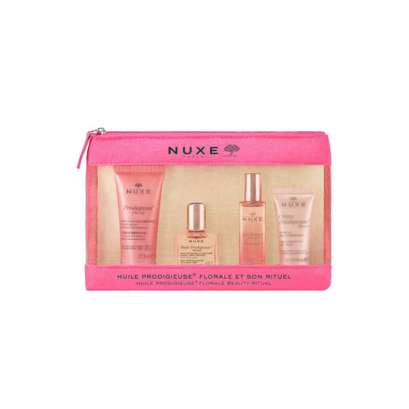 - Nuxe Huile Prodigieuse Florale Óleo (10ml) é um cuidado nutritivo, indicado para rosto, corpo e cabelo. A sua fórmula contém sete óleos preciosos de origem vegetal que hidratam, reparam, nutrem, suavizam e protegem a pele, proporcionando uma beleza natural. Ajuda a reduzir o aparecimento de estrias. Perfume floral com notas de casca de toranja, magnólia e almíscar. - Nuxe Prodigieux Floral Perfume (15ml) é um perfume floral e fresco que nos transporta para uma viagem sensorial, demarcada por toques cristalinos e enaltecida por notas florais de magnólia. - Nuxe Crème Prodigieuse Boost Creme (15ml) é um creme para as primeiras rugas, indicado para pele normal a seca. A fórmula contém um complexo antioxidante com flor de jasmim e flor de calêndula; ácido hialurónico com ação hidratante; e óleo de macadâmia com ação nutritiva. Protege a pele dos efeitos do stress oxidativo, principal responsável pelo envelhecimento cutâneo, e suaviza as primeiras linhas de expressão. Textura aveludada que devolve o conforto à pele.