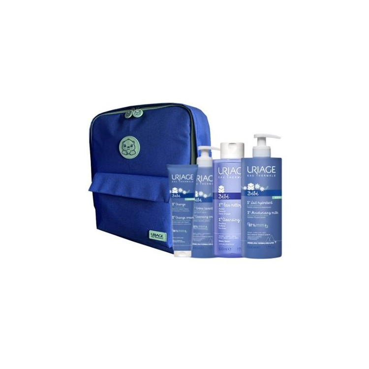 A 1ª mala de maternidade para o teu bebé Azul e Verde Contém: Uriage 1ª Muda 100ml - Muda da fralda A 1ª muda da Uriage protege e isola a pele do rabinho do bebé.  Uriage 1ª Água de Limpeza 500ml - Higiene sem enxaguamento Limpa delicadamente o rosto, corpo e rabinho do bebé. Com Água Termal de Uriage, deixa a pele do bebé suave e com um cheirinho irresistível. O seu novo doseador permite uma aplicação fácil.  Uriage 1º Creme Lavante 200ml - Banho Higiene suave da pele do rosto e corpo do bebé no banho diário. Com uma textura cremosa, limpa em suavidade e preserva o filme hidrolipídico.  Uriage 1º Leite Hidratante 500ml - Hidratação Leite hidratante corporal fluido e ligeiro, ideal para a hidratação e cuidado diário da pele do rosto e corpo dos bebés. Uriage Bebé 1º Leite Hidratante é um cuidado indispensável para recuperar o conforto da pele que por vezes fica seca devido à fricção da roupa, ao calcário da água e ao clima. Recomendado e utilizado em maternidades.